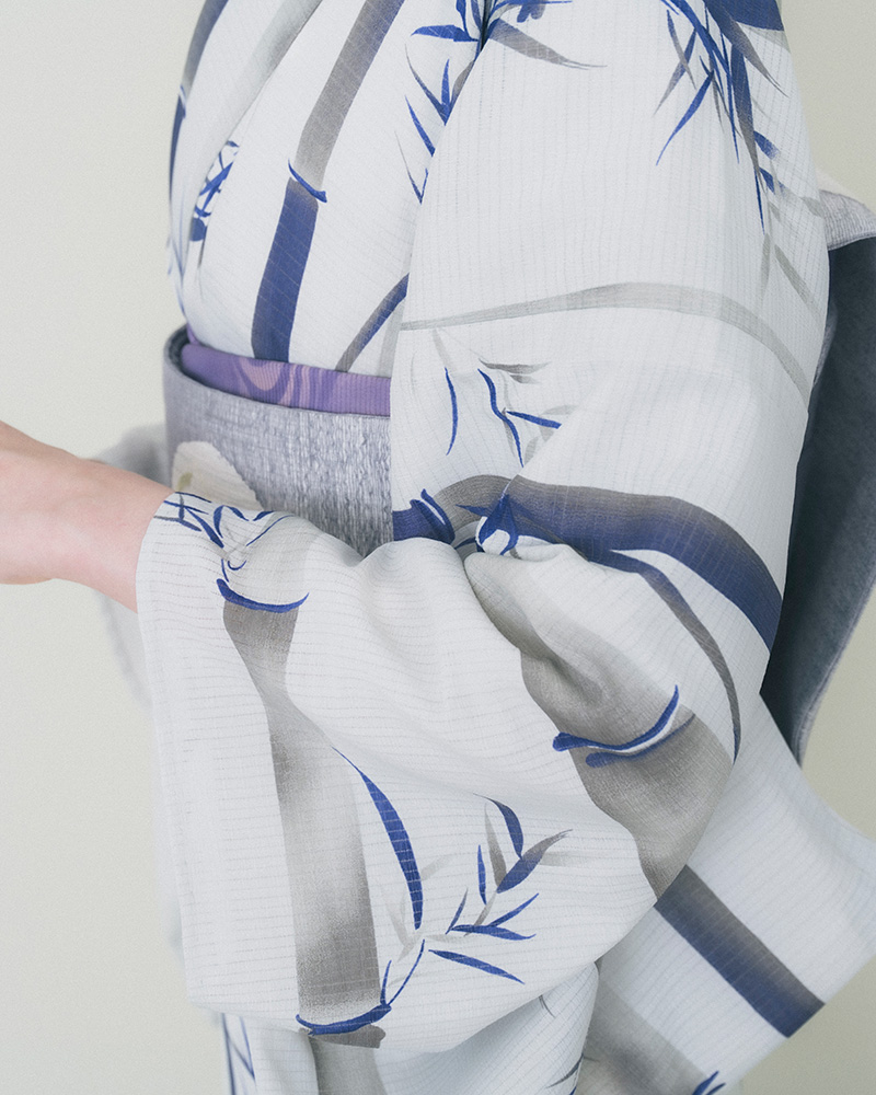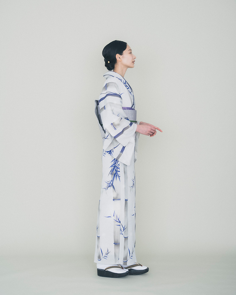 まるで水墨画のようなタッチで描かれた竹林に目を凝らすと、ふんわりと光を放つ場所があります。「青竹」は竹取物語に着想を得た一枚です。着物では定番の文様ですが、太さの異なる三本の竹が生み出す抑揚は着姿に面白みを与えてくれます。
