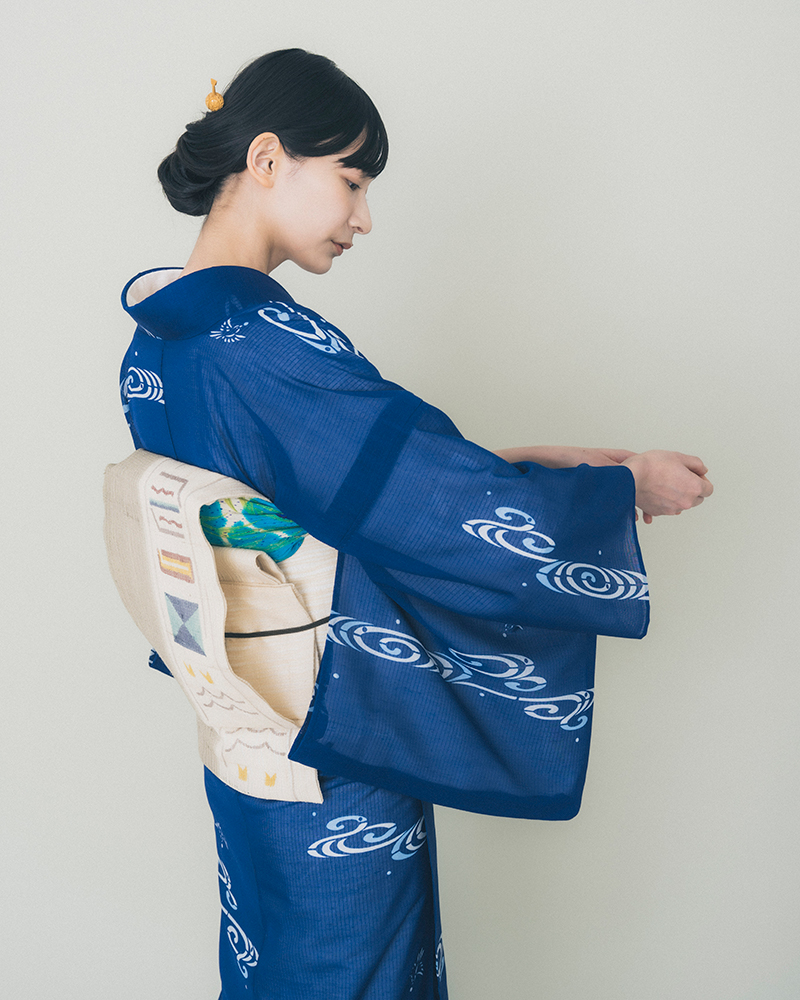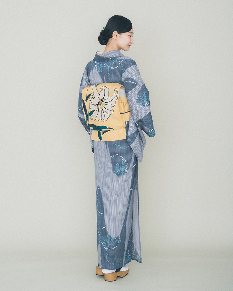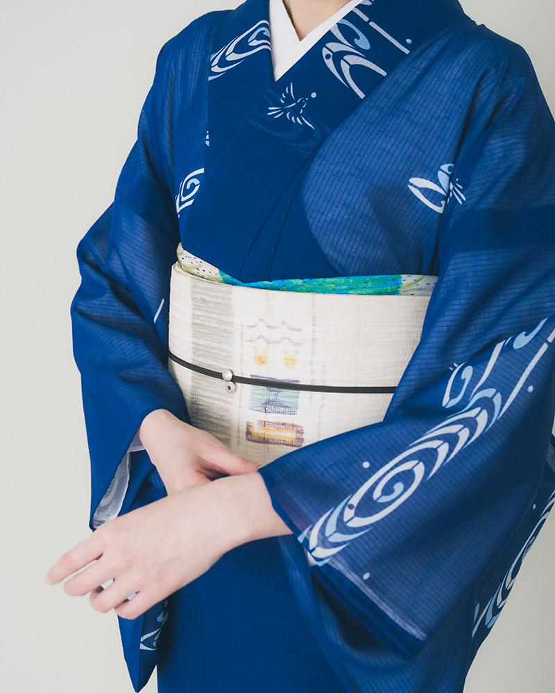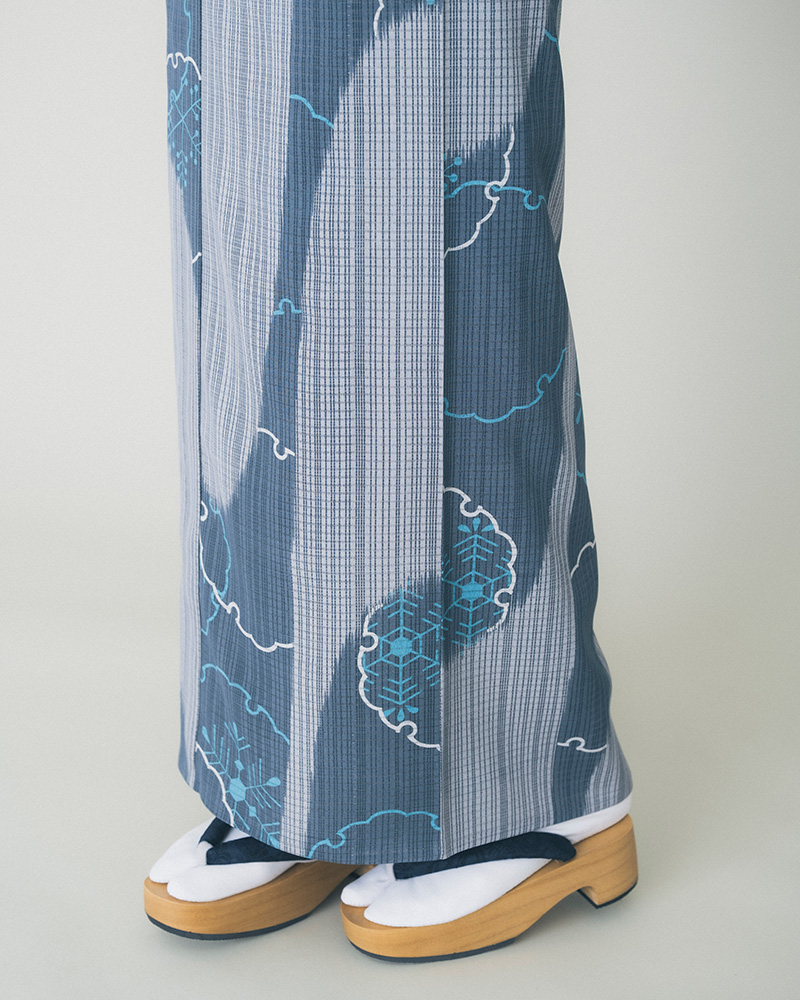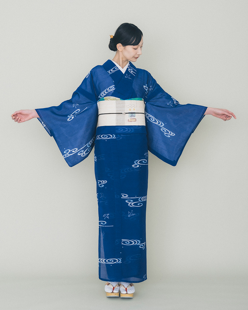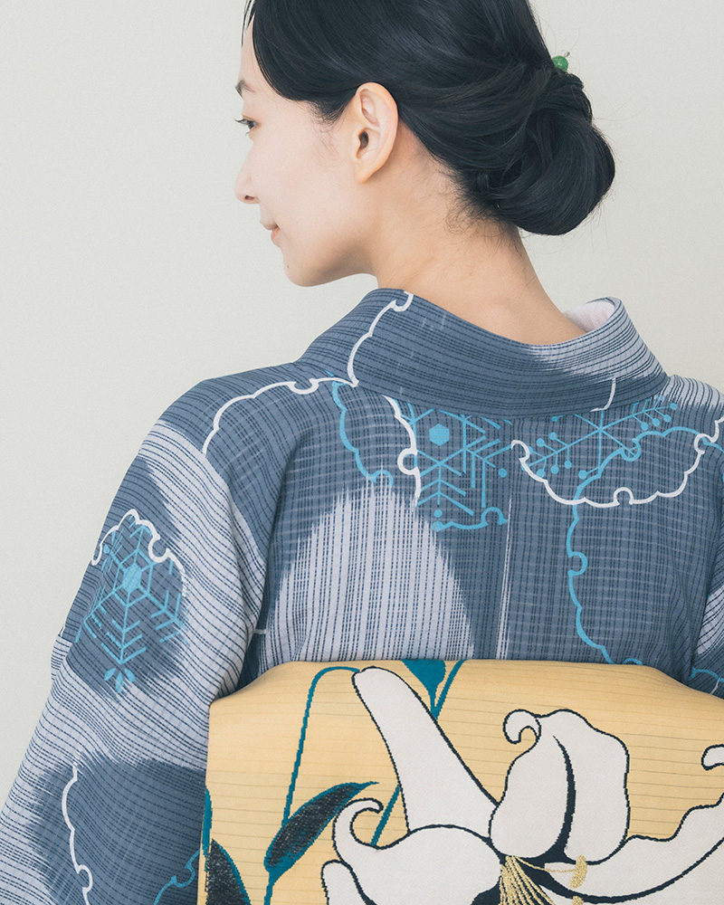 吹雪のように大きくうねる壺だれから現れるのは、美しい雪輪と雪華の文様。イメージは雪女です。冬の文様ではありますが「雪の冷たさを夏に纏って涼をとる」先人たちの粋な着こなしに倣いました。のびのびと描かれたアンティーク感たっぷりの1枚は帯や小物で色のコントラストを効かせた着こなしが似合いそうです。